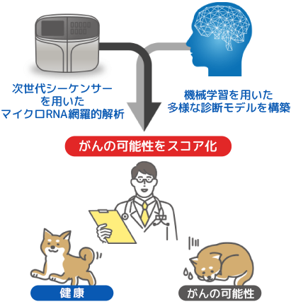 myRNA DOGsは、「マイクロRNA」の技術と、「機械学習(AI)」の技術を用いた愛犬向けのがん検査サービスです。
